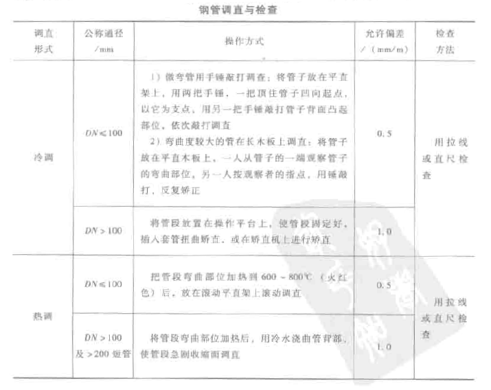 鋼管安裝后使用中被撞彎、壓扁;在運輸、裝卸、堆放過程中產生彎曲,特別是規格較小的低壓流體輸送用焊接鋼管,更容易產生彎曲。為了保證鋼管正常使用,應對鋼管進行調直。彎曲度允許偏差和檢查方法見下表。